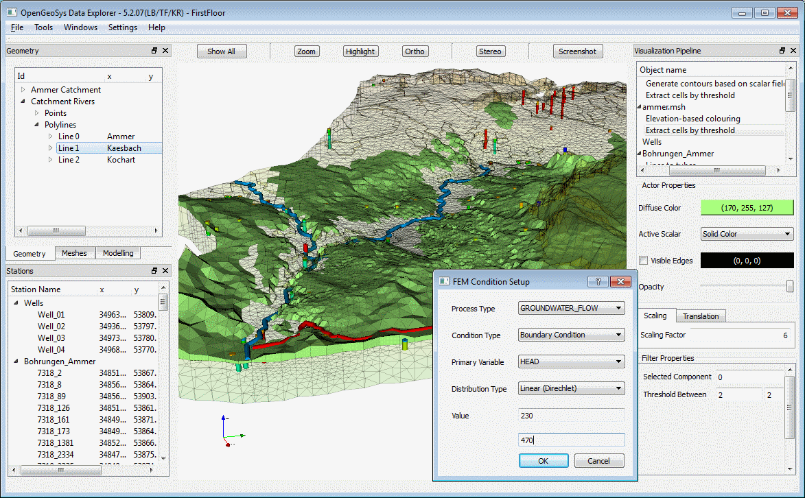 Integrate and visualize data sets for OpenGeoSys by using the OpenGeoSys Data Explorer. It provides functionality to visually assess the data and see possible artefacts, inconsistencies between data sets or missing information.