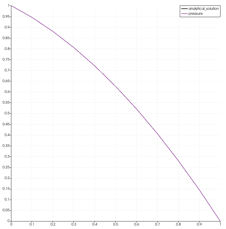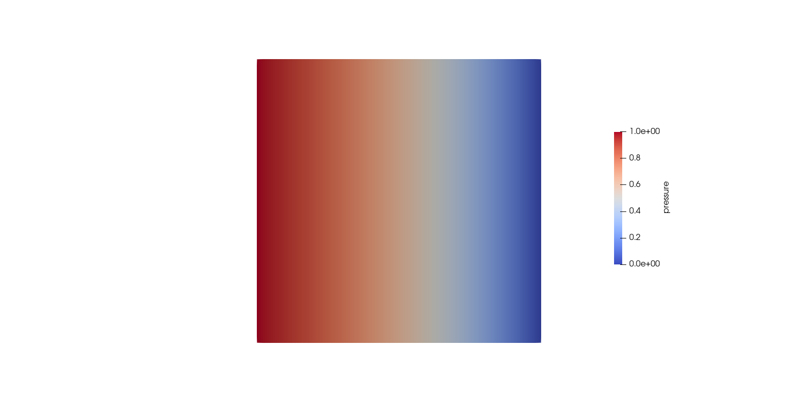 $$ \eqalign{ p(x,y) = 1 &\quad \text{on } (x=0,y) \subset \Gamma_D,\cr p(x,y) = 0 &\quad \text{on } (x=1,y) \subset \Gamma_D,\cr k\\;{\partial p(x,y) \over \partial n} = 0 &\quad \text{on }\Gamma_N. }$$and the source term is $Q=1$.