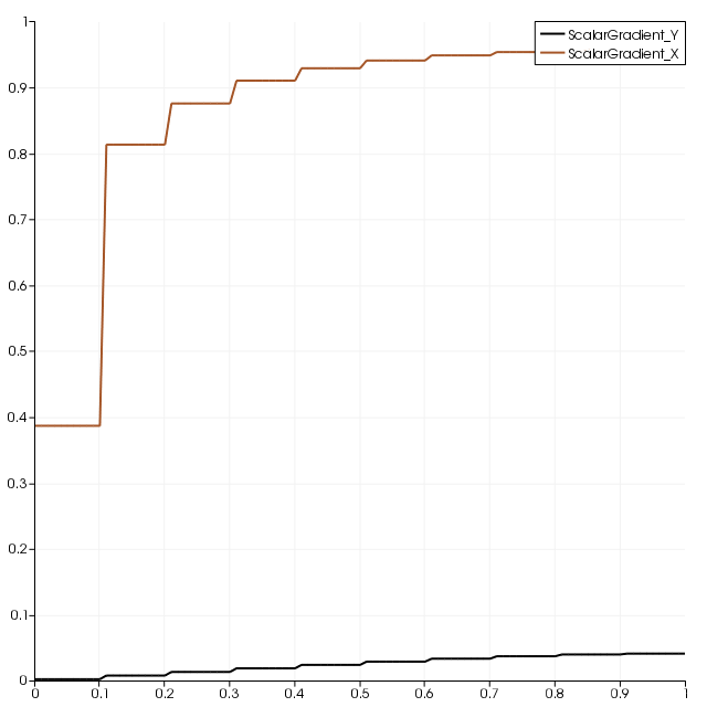 The homogeneous Neumann boundary condition on the top side is satisfied (ScalarGradient_Y is close to zero). The inhomogeneous Neumann boundary condition on the bottom is satisfied only for $y > 0.3$ (where the ScalarGradient_X is close to one) because of incompatible boundary conditions imposed on the bottom right corner of the domain.