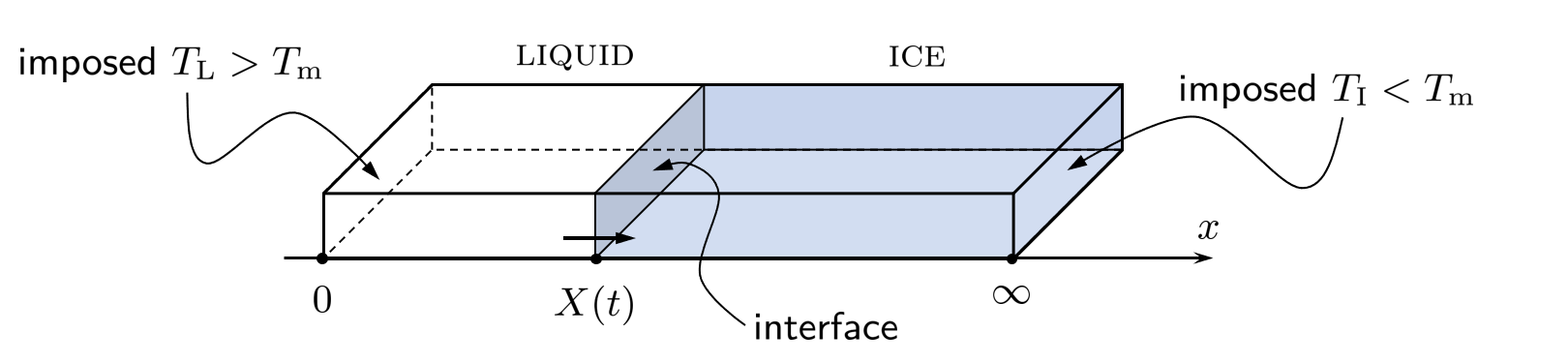 The detailed Stefan problem description, geometric setup, material and model parameters used in the related OGS implementation can be found in this document this PDF. The figures below are taken from this documentation and serve for illustrative purposes to give a hint about the modeled process and simulations outcome.