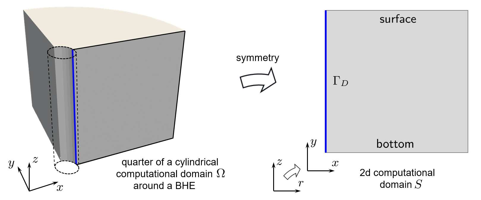 Note that $(r,z)\in S$ are denoted as $(x,y)$ which are assumed to be unrelated to the coordinate notations in the original 3d formulation. 2. The initial condition for $T$ in $S$ is assumed to be a positive function which decays linearly from surface to bottom. For modeling the (time-dependent) boundary conditions on $\Gamma_D$ of $S$, it is assumed that within the first $\widehat{t}$ hours, the temperature on $\Gamma_D$ drops continuously from the initial state to the values prescribed by some continuous piecewise linear function of $y$ and such that at the last depth segment it becomes negative. (The latter mimics the impact of the BHE refrigerant with sub-zero temperature.) The figure sketches the situation: