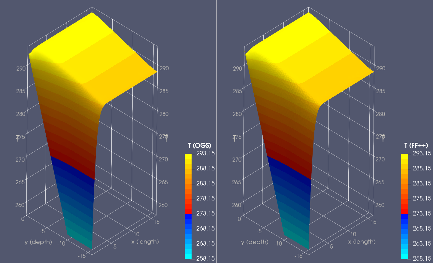 Temperature is given in degrees Celsius. For $t>\widehat{t}$, the prescribed temperature on $\Gamma_D$ and, thus, the heat conduction in the modelled case is triggered by a significant difference between the temperature on $\Gamma_D$ and the initial one within $S$. 3. The results of modelling are depicted in the following two figures, where we plot the temperature distribution in the soil block after 720 hours (30 days) of cooling, and also compare the outcomes of the two corresponding packages: