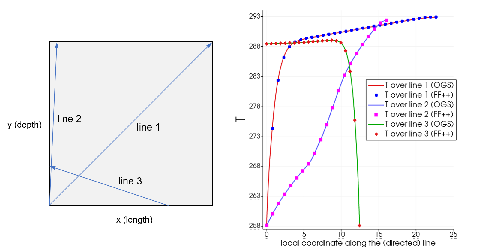 Here, origin of the horizontal axis on the right plot corresponds to line’s origin. For the selected lines, the compared data seems identical point-wise, thus supporting the quantitative similarity of the OGS and FF++ results observed earlier.