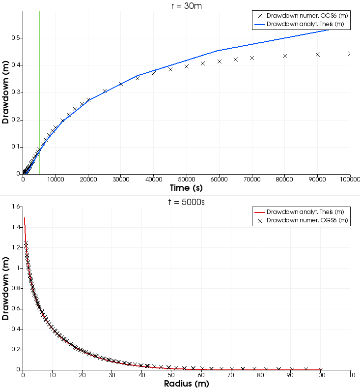 The lower figure shows drawdown over radius at time $t = 5000 s$; the top figure also signifies this with a green vertical: over the whole domain, the analytical and numerical solutions are coinciding very well. NB: With higher values of $S_s$, one has to take care to convert the simulated water level to equivalent freshwater head; in this case, fluid density variation is very low such that a conversion is not required.