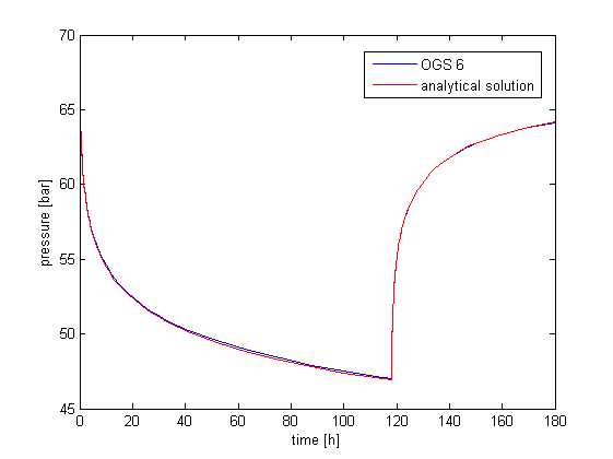 The pressure buildup test is performed by shutting in a producing well at time $t=t_p$, after which a smooth rise of the well head pressure can be observed. For a geothermal reservoir, the buildup test result is interpreted using a Horner plot in order to evaluate the reservoir permeability or transmissivity. In this benchmark, observation data from a geothermal well is employed to parameterize the numerical model. In the model, a time dependent nodal source term was set up to represent the shut-in operation. The simulated pressure profile is then verified against the analytical solution.
