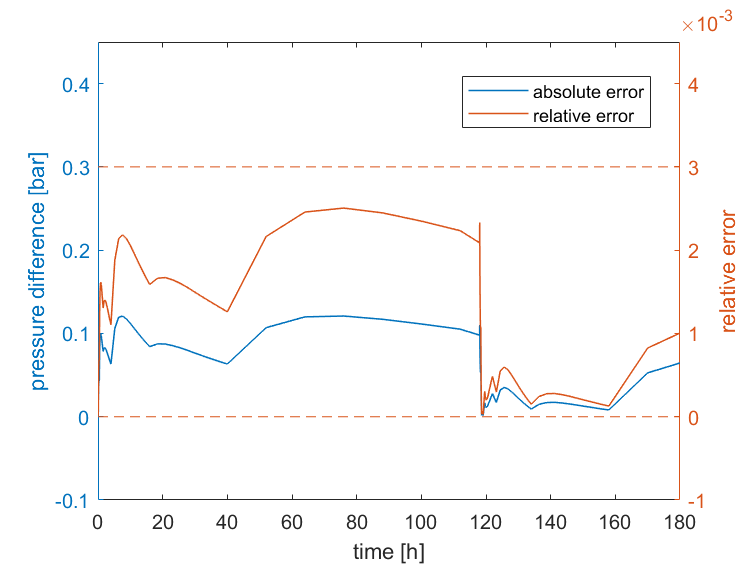 $$\Delta p=\rho g \frac{-Q}{4\pi T}W\left(\frac{r^2S}{4Tt}\right)+\rho g \frac{Q}{4\pi T}W\left(\frac{r^2S}{4T(t-t_p)}\right)$$The pressure evolution is simulated throughout the domain and the result is compared with the analytical solution at $r=10.287\ \mathrm{m}$. In Figure 2, it can be observed that the numerical model fits with the analytical solution very well. The absolute and relative error between the analytical and numerical solution is depicted in Figure 3.