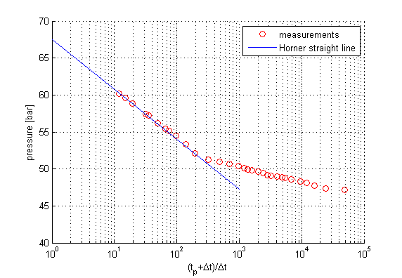 The permeability of the reservoir can be estimated by means of a Horner plot, in which the pressure $p$ is plotted against $(t_p+\Delta t)/\Delta t$, i.e. Horner time on a semi-logarithmic scale (cf. Figure 1). In the Horner plot, the data points form a straight line in the late-time period of the test. Note that the time increases in the opposite direction of the X-axis. Therefore, the linear section appears at the left side of the diagram.