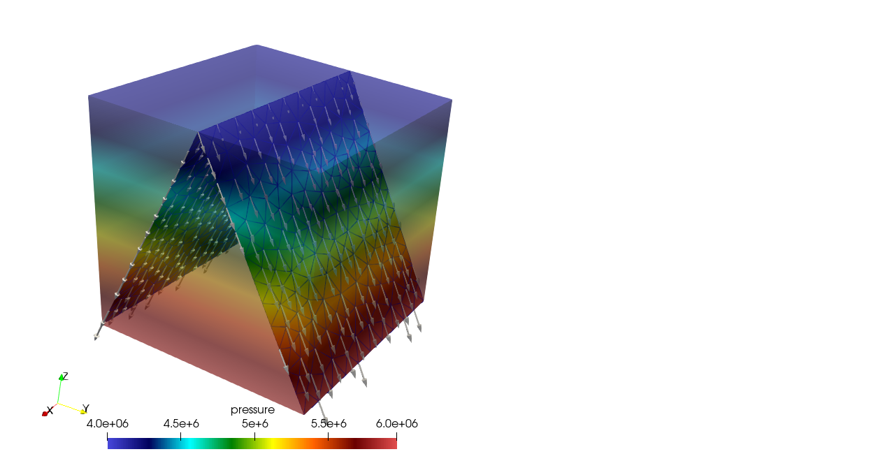 The input files are given in the sub-directory of FractureIn3D. This benchmark tests the case of the mesh contains both 3D elements and inclined 2D element. The analysed domain has two intersected fractures. The brick shape domain is discretised into tetrahedra, while the two planes are discretised into triangles. The permeability of the continuous domain is