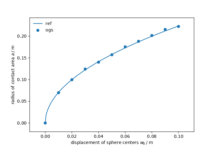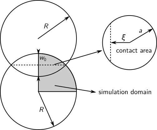 Two elastic spheres of same radius $R$ are brought into contact. The sphere centers are displaced towards each other by $w_0$, with increasing values in every load step. Due to symmetry reasons a flat circular contact area of radius $a$ forms.