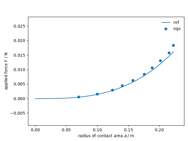 The simulation results for contact radii and total force reproduce the analytical square root and cubic laws, respectively. For the average pressure $\bar p$ the analytical form of $(\ref{eq:bar-p})$ is reproduced, too. But for $\bar p$ there are rather strong deviations between the numerical and analytical results, which might be due to deviations in the contact radii $a$, due to insufficient mesh resolution or due to the chosen linear order of FEM ansatz functions.