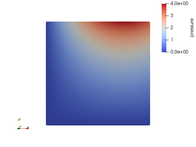 As boundary conditions we apply Dirichlet BCs at the top, left and bottom of the domain with values from $u(x,y)|\_{\Gamma_{\mathrm{D}}}$. On the right boundary of the domain a Neumann BC is applied. There $n = (1, 0)$, which implies that $a \mathop{\mathrm{grad}} u \cdot n = a \, \partial u / \partial x$.