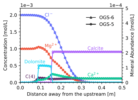 At the simulated time, it can be clearly seen that the MgCl$_2$ solution front has penetrated ~0.3m of the column resulting in the dissolution of calcite and dolomite precipitation. Total aqueous concentration and solid profiles obtained of OGS-6 are in good agreement with those of OGS-5. The absolute error in terms of component concentrations is $2.15\times10^{-5}$ (Cl), $1.13\times10^{-5}$ (Mg), and $4.57\times10^{-6}$ (Ca). Additionally, pH profiles calculated with both codes are in good agreement.