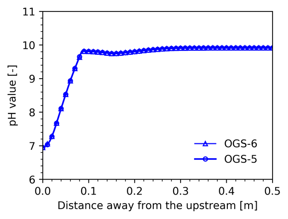 A comparison of the results obtained with OGS-6#IPhreeqc and OGS-5#IPhreeqc at the end of the simulation is shown in the Figures below.