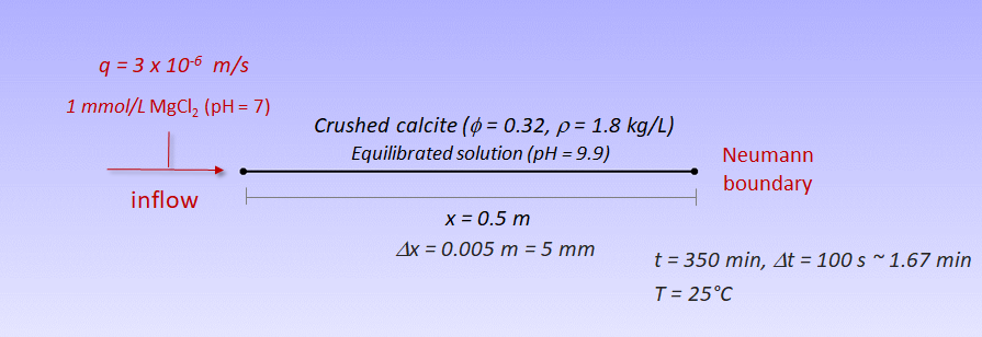 Very briefly, the studied system consists on a column of 0.5 m, initially containing crushed calcite (CaCO$_3$(s)), which is continuously fluxed with a 1 millimolar (mmol/L) magnesium chloride (MgCl$_2$) solution at pH = 7 and 25°C during 350 min (~ 5.8h) at a constant flow rate of 0.18 L (or a Darcy velocity (q) of $3\times10^{-6}$ m/s, considering a cross-sectional area of 1 m$^2$).