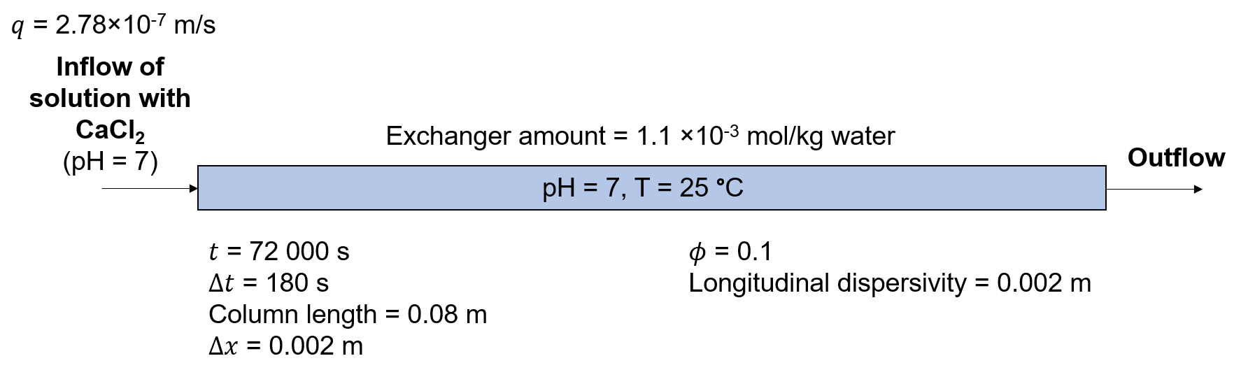 This benchmark simulates the chemical composition of the effluent from a column containing a cation exchanger (Example 11 in the PHREEQC 3 documentation). The following setup is used for the simulation: