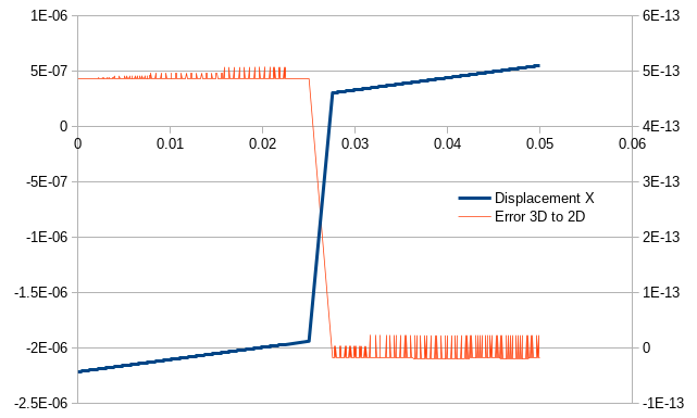 in order of 1e-15); Resulting displacement on the left axis, and error on the