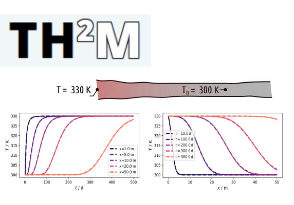 Some of the collected benchmarks for the TH2M process can be accessed here. Since fully coupled benchmarks are very rare, and since the TH2M process is rather complex, part of the benchmark hierarchy presented and described in Grunwald et al 2020 and 2022 is provided here. This hierarchical ordering of test examples reduces the complex system of equations to simpler combinations of the individual physical processes. Each of the reasonable subsets of process combinations is tested against closed-form solutions, the results of physical experiments, or by comparison with other codes.