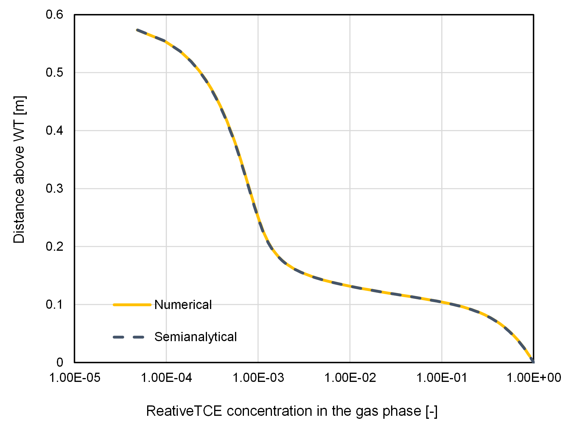 In this benchmark, the steady-state diffusive transport of trichloroethylene (TCE) across a variably saturated zone (capillary fringe) is simulated and compared with the semianalytical solution proposed by Atteia and Höhener [1].