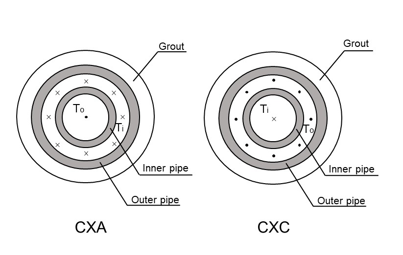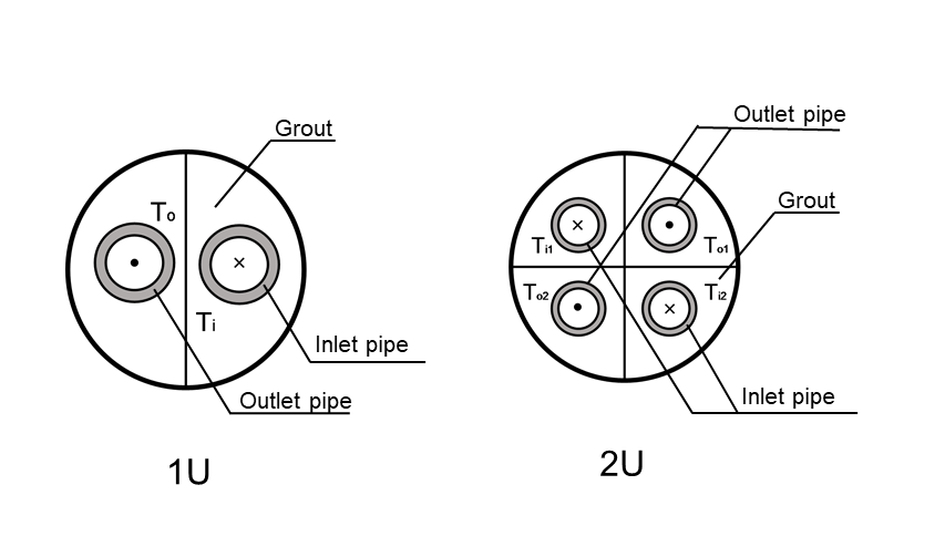 1U: means there is only one single U-tube installed in the borehole;2U: double U-tubes installed in the borehole;CXA: coaxial pipe with annular space as the inlet downwards flow and the centre part as