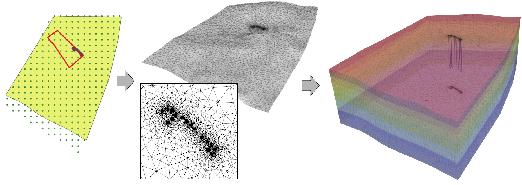 NOTE: If some boreholes are given at the beginning of the meshing process, it is recommended to use the OpenGeoSys DataExplorer – Manual / Download. At first, the nodes for boreholes can be integrated into the mesh, when the mesh is generated from a geometry. For this purpose, the boreholes and the boundaries of the geometry need to be imported in DataExplorer. Then this mesh can be used to create a 3D mesh, either with the DataExplorer or with createLayeredMeshfromRaster, which then can be used for integrating boreholes. This procedure is useful because the mesh is generated in a way that the coordinates of the boreholes are nodes in the mesh. Otherwise the borehole’s coordinates need to be adjusted according to a existing mesh. This process is schematically depicted in Fig.1, below.